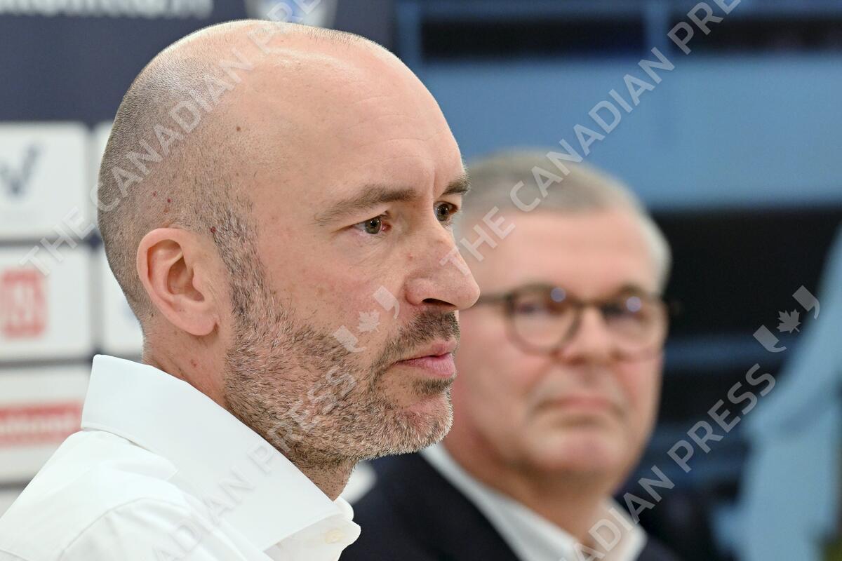 Coach Jacob Friis (L) of Denmark and Ari Lahti, pesident of the Finnish Football Association, are seen during a press conference at the Olympic Stadium in Helsinki, Finland, on January 20, 2025. Jacob Friis was introduced as the new head coach of the Finnish national football team Huuhkajat. LEHTIKUVA / JUSSI NUKARI - FINLAND OUT. NO THIRD PARTY SALES.