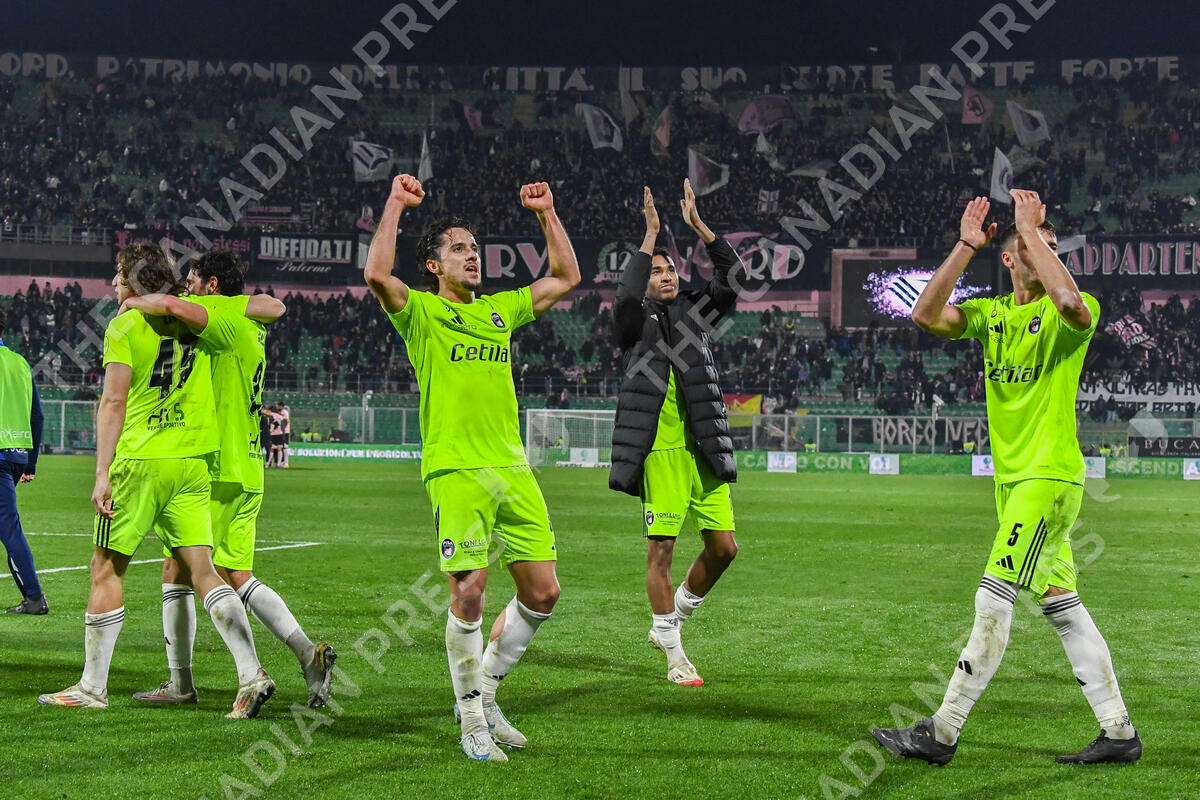 Pisa team celebrates the victory under fans sector during Palermo FC vs AC Pisa, Italian soccer Serie B match in Palermo, Italy, January 31 2025