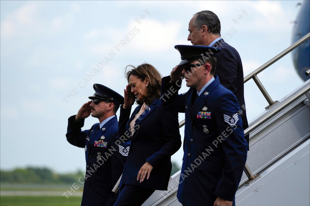 Democratic presidential nominee Vice President Kamala Harris and second gentleman Doug Emhoff arrive on Air Force Two in Philadelphia, Tuesday, Aug. 6, 2024. (AP Photo/Matt Rourke)