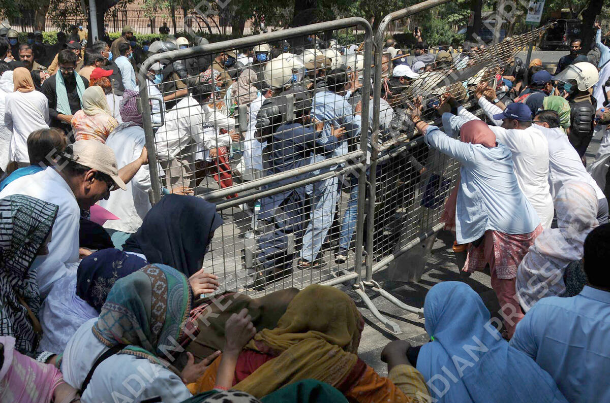 March 6, 2007, Pakistan: LAHORE, PAKISTAN, APR 28: Members of Grand Health Alliance (GHA) are trying to move .towards CM House while police officials barricade the protesters during protest demonstration .against the privatization of hospitals, basic health units and rural health centers, at Mall road in .Lahore on Monday, April 28, 2025. (Credit Image: © PPI via ZUMA Press Wire)