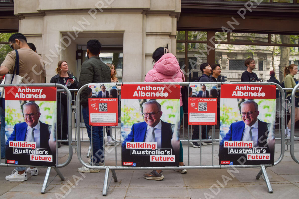 April 26, 2025, London, England, United Kingdom: Posters promote Anthony Albanese as Australians cast their votes at Australia House, the Australian High Commission in central London, ahead of the Australian federal election. (Credit Image: © Vuk Valcic/ZUMA Press Wire)