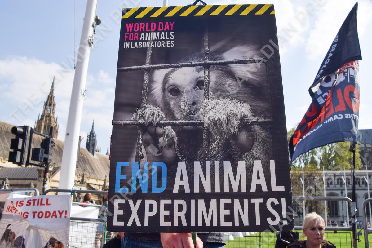 April 28, 2025, London, United Kingdom: A protester holds an 'End animal experiments' placard in Parliament Square during a demonstration against experimentation on animals, as the government debates a petition relating to the use of dogs in scientific and regulatory experiments. (Credit Image: © Vuk Valcic/SOPA Images via ZUMA Press Wire)