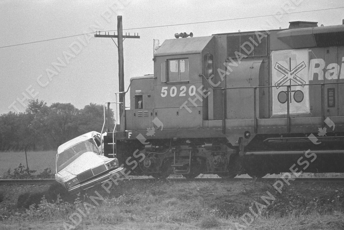 From the archival negative sleeve: Transport Train Crashes Into Parked Car, September 23, 1981. THE CANADIAN PRESS/files