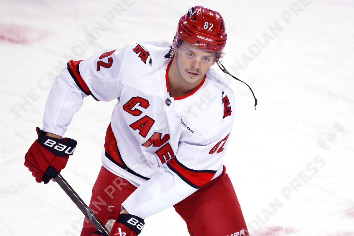 Profile photo on Carolina Hurricanes C Jesperi Kotkaniemi, from Finland, during an NHL (National Hockey League) game against the Calgary Flames in Calgary, Alta., Oct. 24, 2024.THE CANADIAN PRESS IMAGES/Larry MacDougal