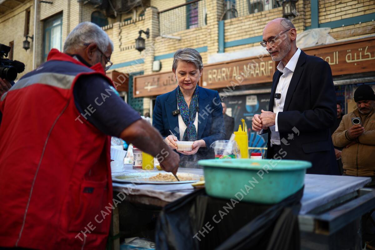 Home Secretary Yvette Cooper and UK ambassador to Iraq Stephen Hitcheneat at a food stall during a visit of Al-Mutanabbi Street, in Baghdad, during an official three-day visit to Iraq. Picture date: Wednesday November 27, 2024.