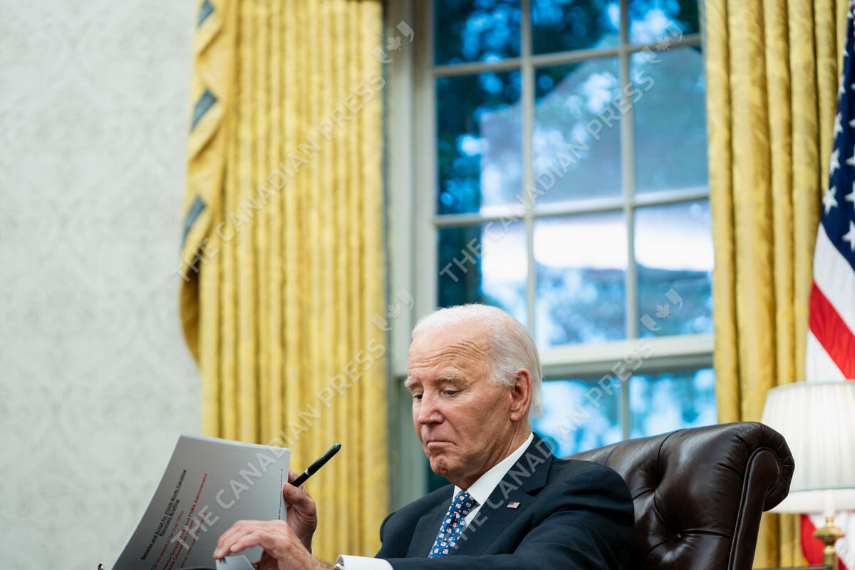 President Joe Biden speaks after a briefing from Governor of North Carolina Roy Cooper and FEMA Administrator Deanne Criswell on the latest operational updates from the impact of Hurricane Helene in the Oval Office at the White House in Washington, DC on Monday, September 30, 2024. Photo by Bonnie Cash/Pool/ABACAPRESS.COM