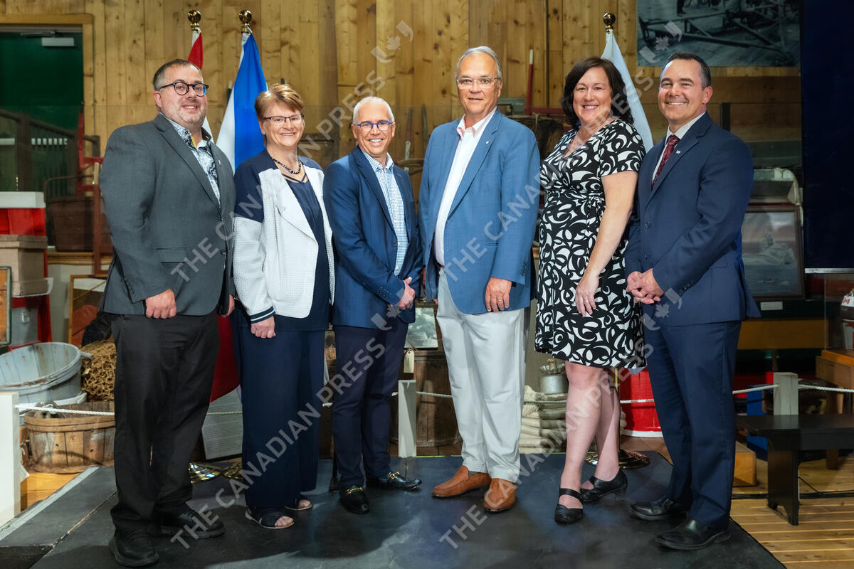 High Liner Foods celebrates its 125th anniversary at a reception held at the Fisheries Museum of the Atlantic in Lunenburg, Nova Scotia on Monday, September 23, 2024. Special guests and local dignitaries attended to honour the company for its tenure and impact on the community in Nova Scotia. From left to right: Mayor of the Town of Lunenburg, Jamie Myra, Mayor of The Municipality of the District of Lunenburg, Carolyn Bolivar-Getson, High Liner Foods President & CEO, Paul Jewer, High Liner Foods Chair of the Board, Robert Pace, the Honourable Susan Corkum-Greek, Minister of Economic Development, and the Honourable Kent Smith, Minister of Fisheries & Aquaculture.. The Canadian Press Images PHOTO/Kelly Clark