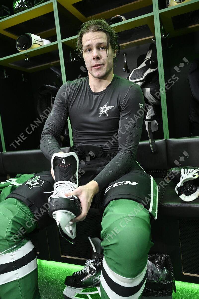 Miro Heiskanen of the Dallas Stars attends the team's practice in Tampere, Finland, on October 31, 2024. The Dallas Stars and the Florida Panthers will meet in two NHL Global Series games in Tampere later this week. LEHTIKUVA / HEIKKI SAUKKOMAA - FINLAND OUT. NO THIRD PARTY SALES.