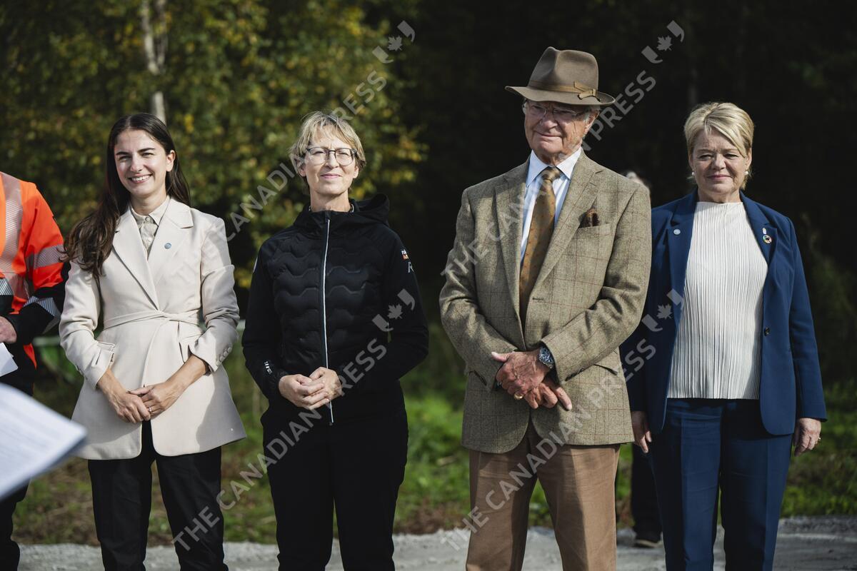 H.M. The King of Sweden visited Tornedalen in Finland and in Sweden on Thursday, 29th August, 2024. Sweden's climate and environment minister Romina Pourmokhtari (L) Finnish agriculture and forestry minister Sari Essayah (2nd L) and Norrbotten's governor Lotta Finstorp (R) . LEHTIKUVA / JOUNI PORSANGER - FINLAND OUT. NO THIRD PARTY SALES.