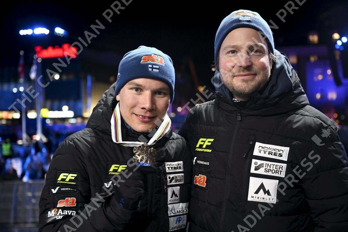 Bronze-medalist Lauri Vuorinen of Finland and Team Finland skiing coach Ville Oksanen during the medal ceremony of the men's cross-country skiing sprint freestyle competition at the FIS Nordic Ski World Championships in Trondheim on February 27, 2025. LEHTIKUVA / MARKKU ULANDER - FINLAND OUT. NO THIRD PARTY SALES.