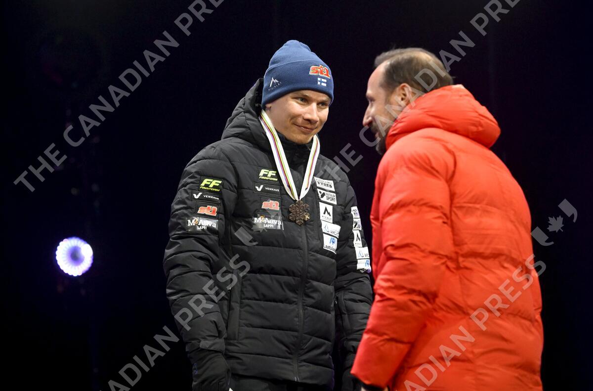 Bronze-medalist Lauri Vuorinen of Finland received his medal from Crown Prince Haakon of Norway during the medal ceremony of the men's cross-country skiing sprint freestyle competition at the FIS Nordic Ski World Championships in Trondheim on February 27, 2025. LEHTIKUVA / MARKKU ULANDER - FINLAND OUT. NO THIRD PARTY SALES.