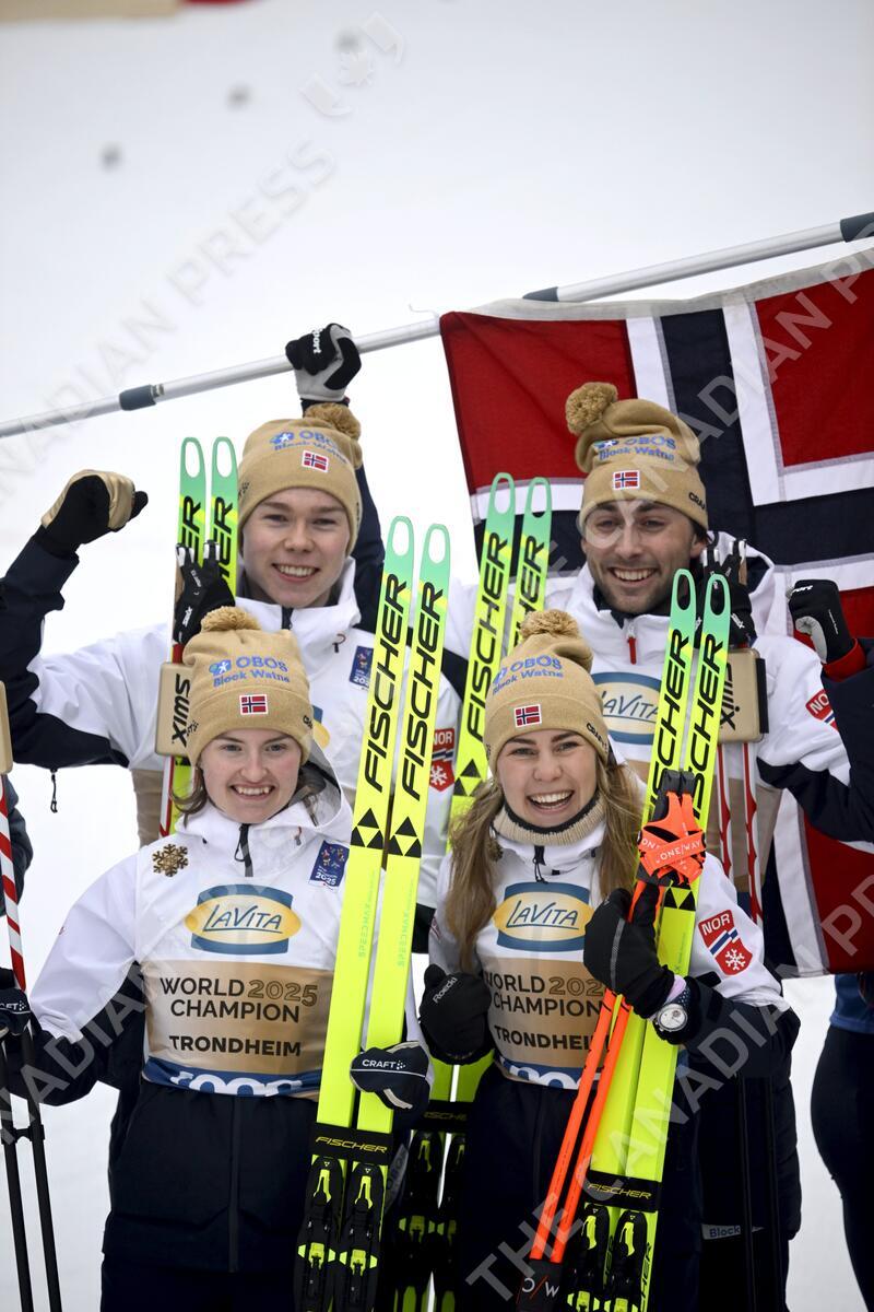 Team Norvay Jens Lurås Oftebro, Jarl Magnus Riiber, Gyda Westvold Hansen and Ida Marie Hagen celebrate after winning the Nordic combined mixed team cross-country skiing 2x5km + 2x2,5km relay competition at the FIS Nordic Ski World Championships in Trondheim on February 28, 2025. LEHTIKUVA / MARKKU ULANDER - FINLAND OUT. NO THIRD PARTY SALES.