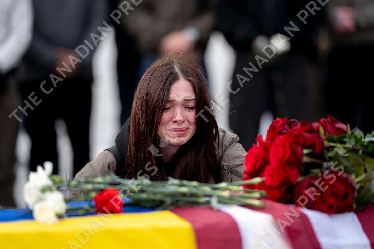 February 28, 2025, Kyiv, Ukraine: Friends and fellow soldiers lay flowers on coffin at Memorial service for U.S. Marine Corps veteran Ethan Hertweck, who fell serving as a combat medic with the Ukrainian armed forces. Hertweck fell in late 2023 in Avdiivka, but his body has only now been recovered. (Credit Image: © Andreas Stroh/ZUMA Press Wire)