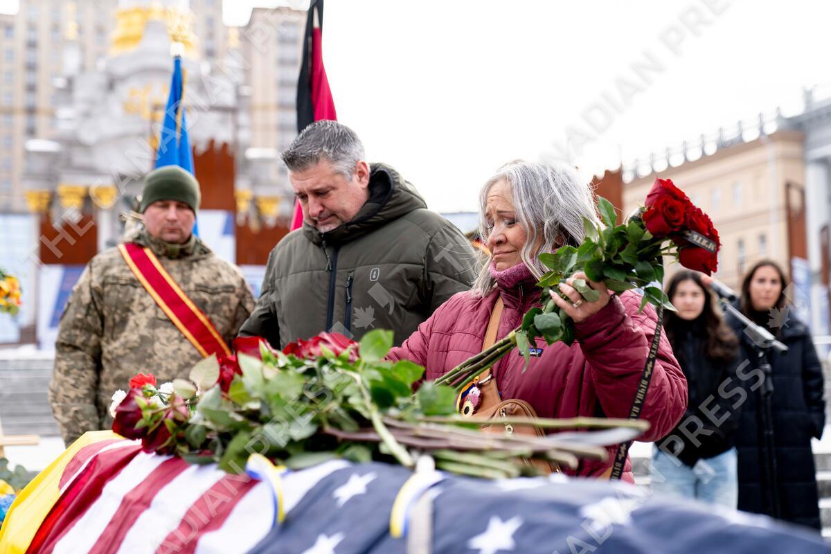 February 28, 2025, Kyiv, Kyiv City, Ukraine: Parents LESLIE Leslie and JOHN HERTWECK at the memorial service for their son Ethan Hertweck, U.S. Marine Corps veteran, who fell serving as a combat medic with the Ukrainian armed forces. Hertweck fell in late 2023 in Avdiivka, but his body has only now been recovered. (Credit Image: © Andreas Stroh/ZUMA Press Wire)