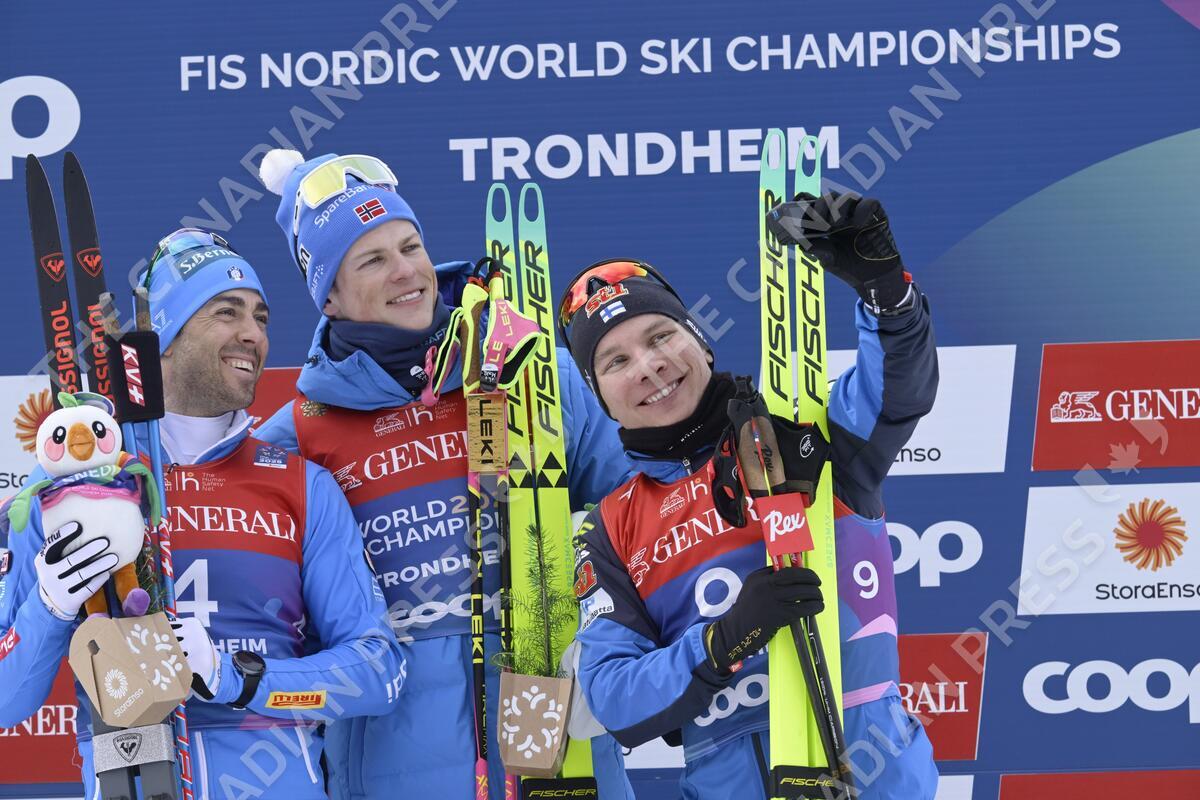 Silver-medalist Federico Pellegrino (L) of Italy, winner Johannes Hösflot Kläbo of Norway and bronze-medalist Lauri Vuorinen of Finland celebrate on the podium after the men's final of the cross-country skiing sprint freestyle finals at the FIS Nordic Ski World Championships in Trondheim on February 27, 2025. LEHTIKUVA / MARKKU ULANDER - FINLAND OUT. NO THIRD PARTY SALES.