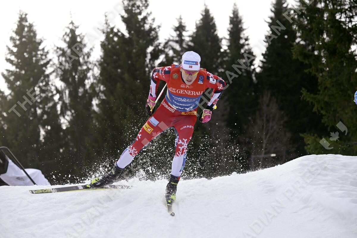 Johannes Hösflot Kläbo of Norway competes during the men's final of the cross-country skiing sprint freestyle finals at the FIS Nordic Ski World Championships in Trondheim on February 27, 2025. LEHTIKUVA / MARKKU ULANDER - FINLAND OUT. NO THIRD PARTY SALES.
