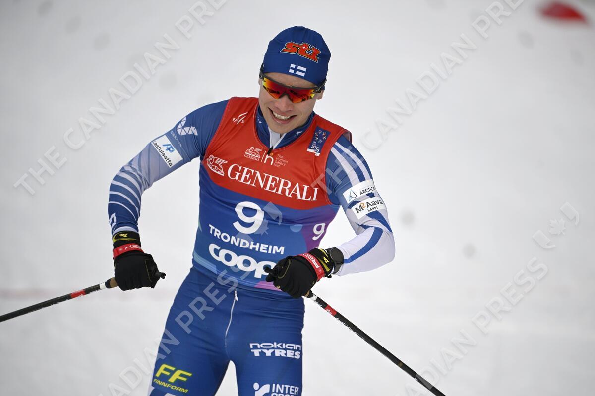 Lauri Vuorinen of Finland reacts after winning bronze in the men's final of the cross-country skiing sprint freestyle finals at the FIS Nordic Ski World Championships in Trondheim on February 27, 2025. LEHTIKUVA / ANTTI AIMO-KOIVISTO - FINLAND OUT. NO THIRD PARTY SALES.