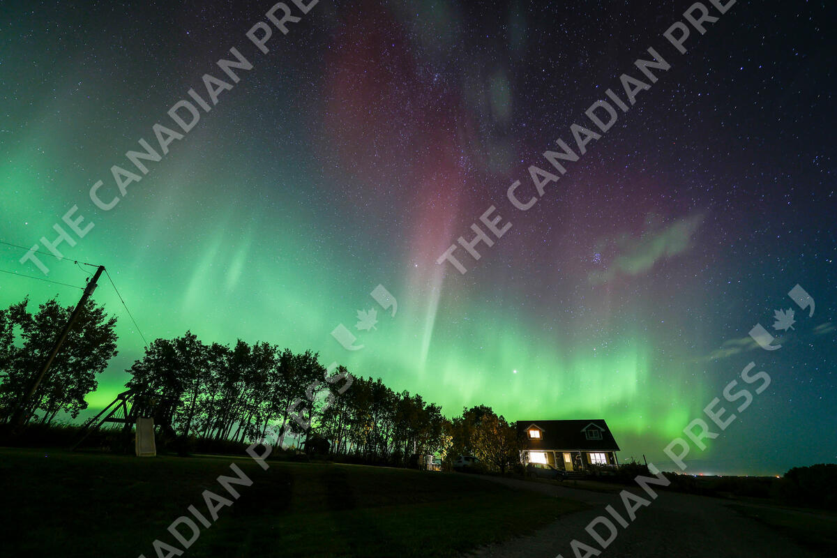 The northern lights (aurora borealis) make an appearance over a home near Cremona, Alta., Monday, Oct. 7, 2024. Auroras are the result of disturbances in the Earth's magnetosphere caused by the solar wind. THE CANADIAN PRESS IMAGES/Jeff McIntosh