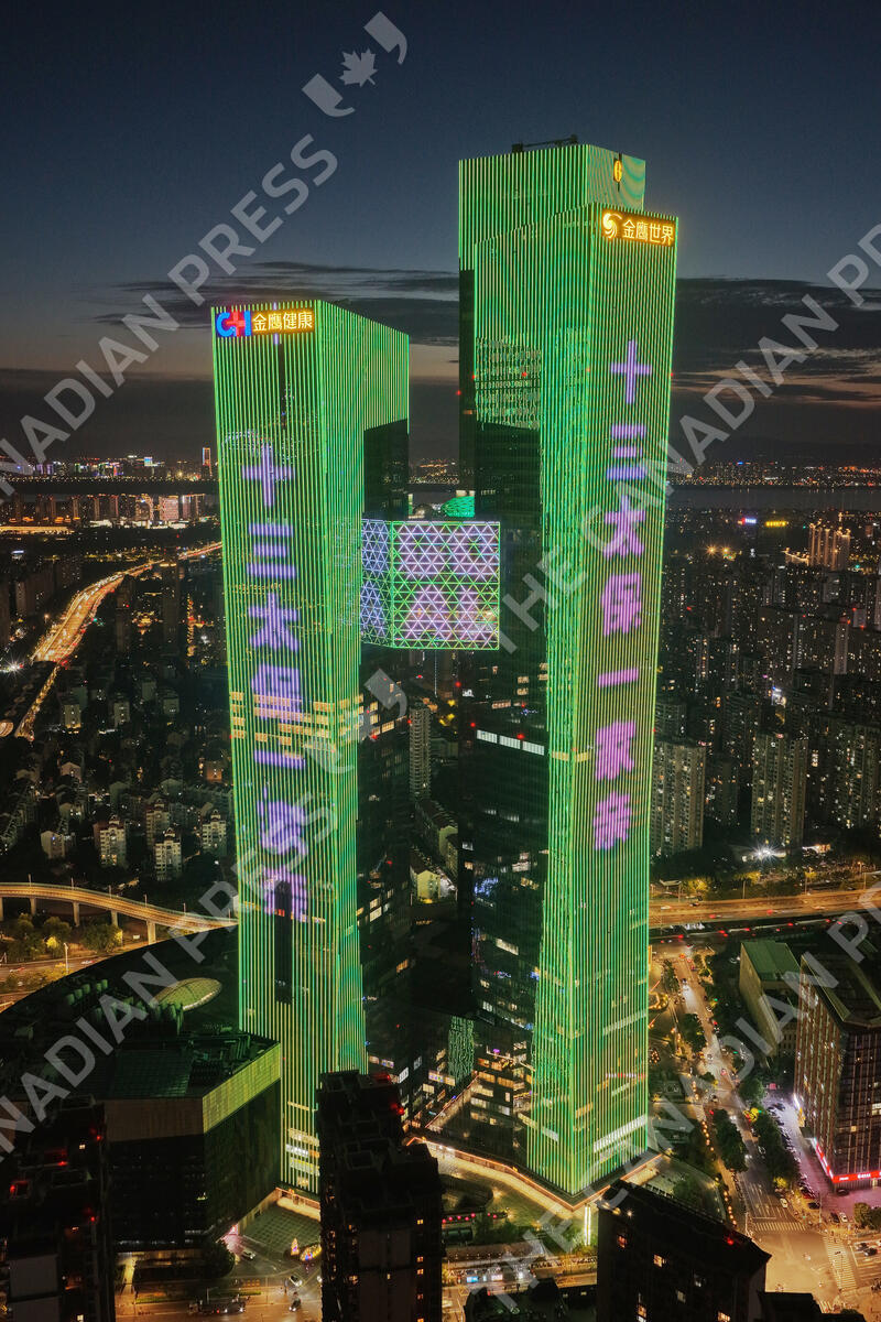 June 30, 2025, Nanjing, Jiangsu, China: The slogan ''JIANSU FOOTBALL Nanjing LEAGUE, Come on!'' is displayed on the GE¡¤WORLD sky screen in Nanjing, Jiangsu, China on June 30, 2025. GE¡¤WORLD consists of three connected towers and a podium at the bottom, and it is the largest single commercial project in all of Asia. (Credit Image: © Cfoto/DDP via ZUMA Press)