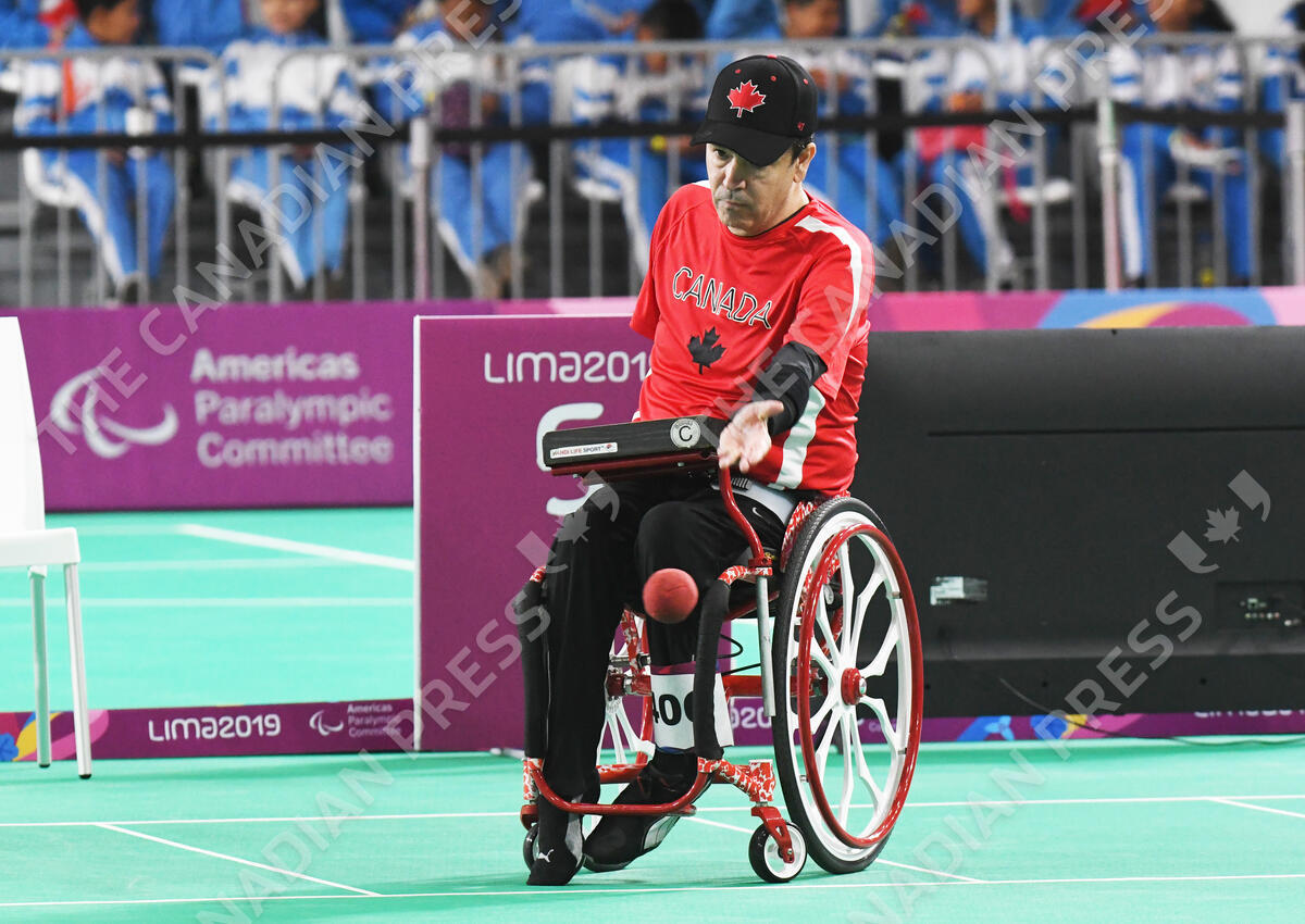Marco Dispaltro competes in boccia at the 2019 Parapan Am Games in Lima, Peru on August 25, 2019. // Marco Dispaltro participe à boccia. CANADIAN PARALYMPIC COMMITTEE, SCOTT GRANT