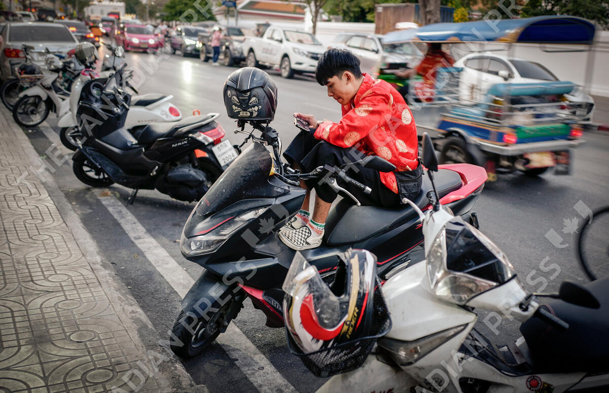 A man in traditional costume checks his smartphone while sitting on a scooter in Bangkok, Thailand, Wednesday, Jan. 29, 2025.THE CANADIAN PRESS IMAGES/Jeff McIntosh
