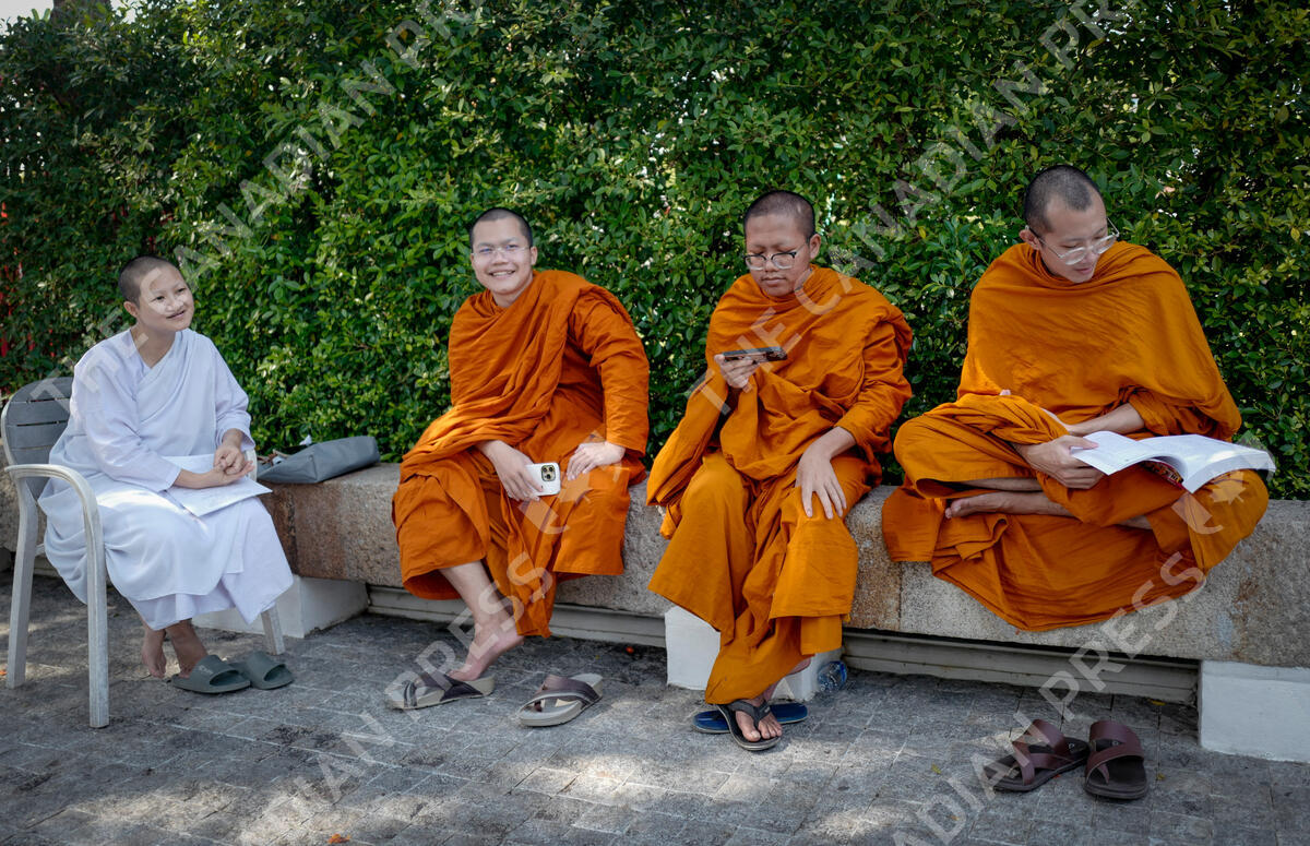 Buddhist monks and a nun relax at Wat Arun in Bangkok, Thailand, Tuesday, Jan. 28, 2025.THE CANADIAN PRESS IMAGES/Jeff McIntosh