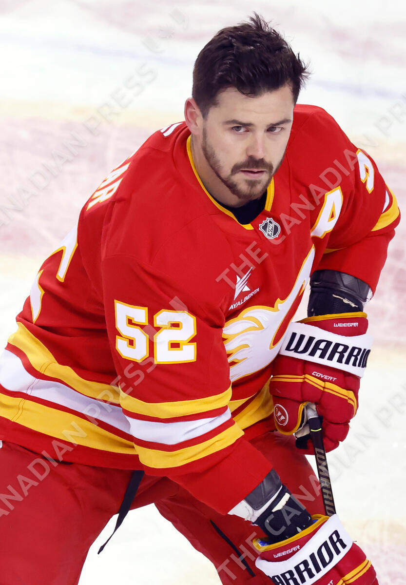Profile photo on Calgary Flames D MacKenzie Weegar during an NHL (National Hockey League) game against the Vegas Golden Knights in Calgary, Alta., April 15, 2025. THE CANADIAN PRESS IMAGES/Larry MacDougal