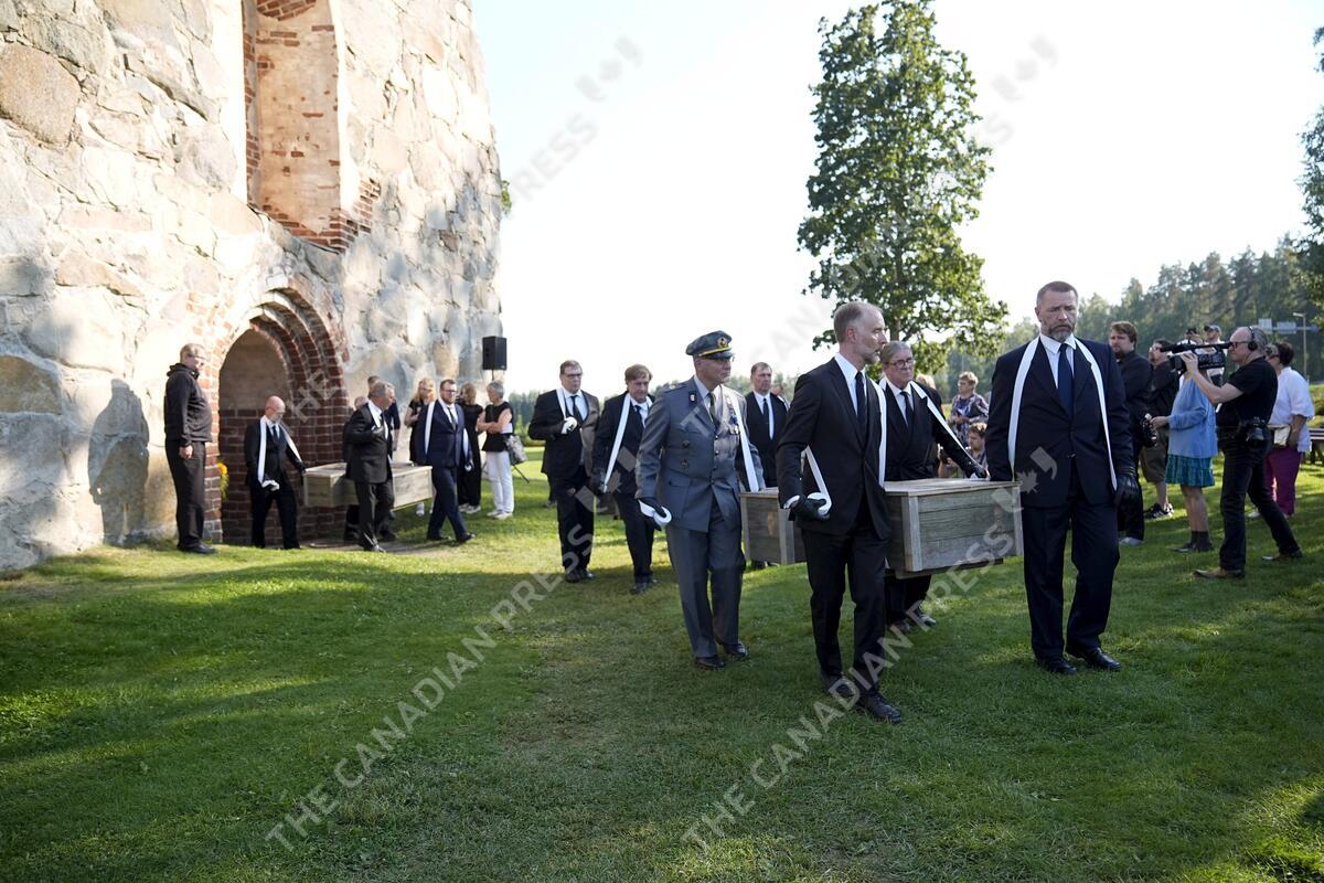 Old Finnish skulls are moved outside Church of St. Michael at Pälkäne, Finland, to be reburied on September 8, 2024. The skulls were taken from Finland to Sweden in the 1870s, and they are returned to their original places of discovery this autumn. LEHTIKUVA / KALLE PARKKINEN - FINLAND OUT. NO THIRD PARTY SALES.