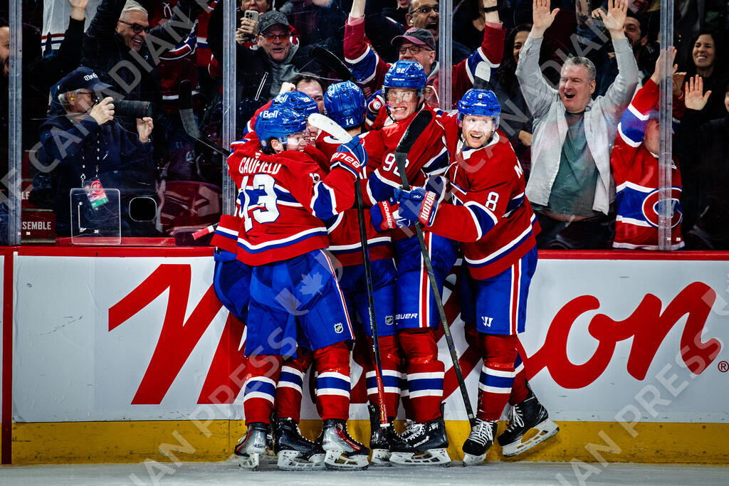 Les joeurs du Canadiens celebrent le but egalisateur de Nick Suzuki durant la troisieme période du match de hockey opposant le Canadien de Montréal au Panthers de la Floride au Centre Bell.