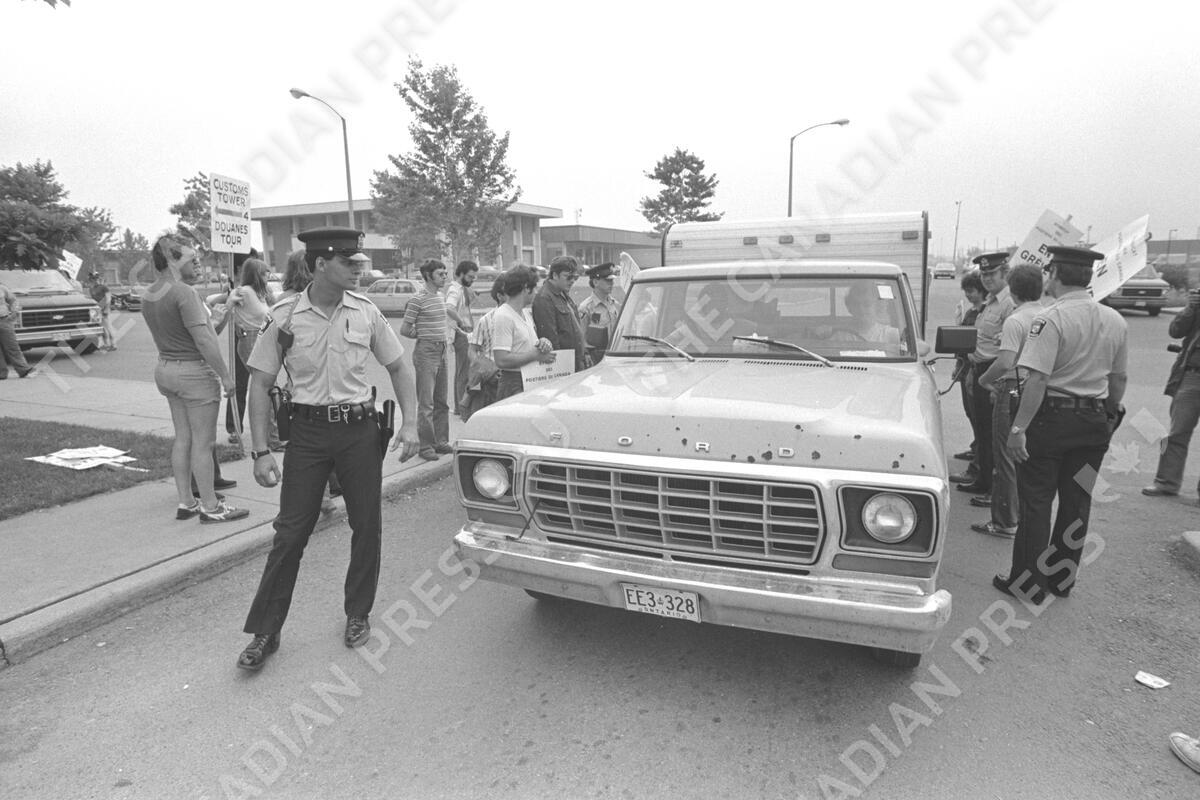 From the archival negative sleeve: Pickets at Post Office -- Police/Picket Incident, June 30, 1981. THE CANADIAN PRESS/Dave Buston