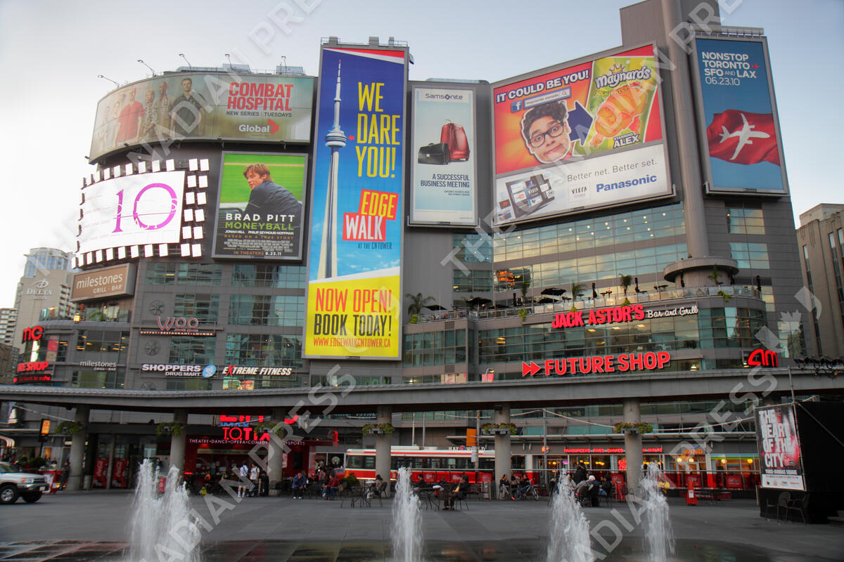 Canada, Ontario, Toronto, Yonge Street at Dundas, Downtown Yonge, Yonge-Dundas Square, AMC Theatres, chain, cinema, movies, billboard, entertainment, ad, Panasonic, Brad Pitt, fountain, public square, urban,