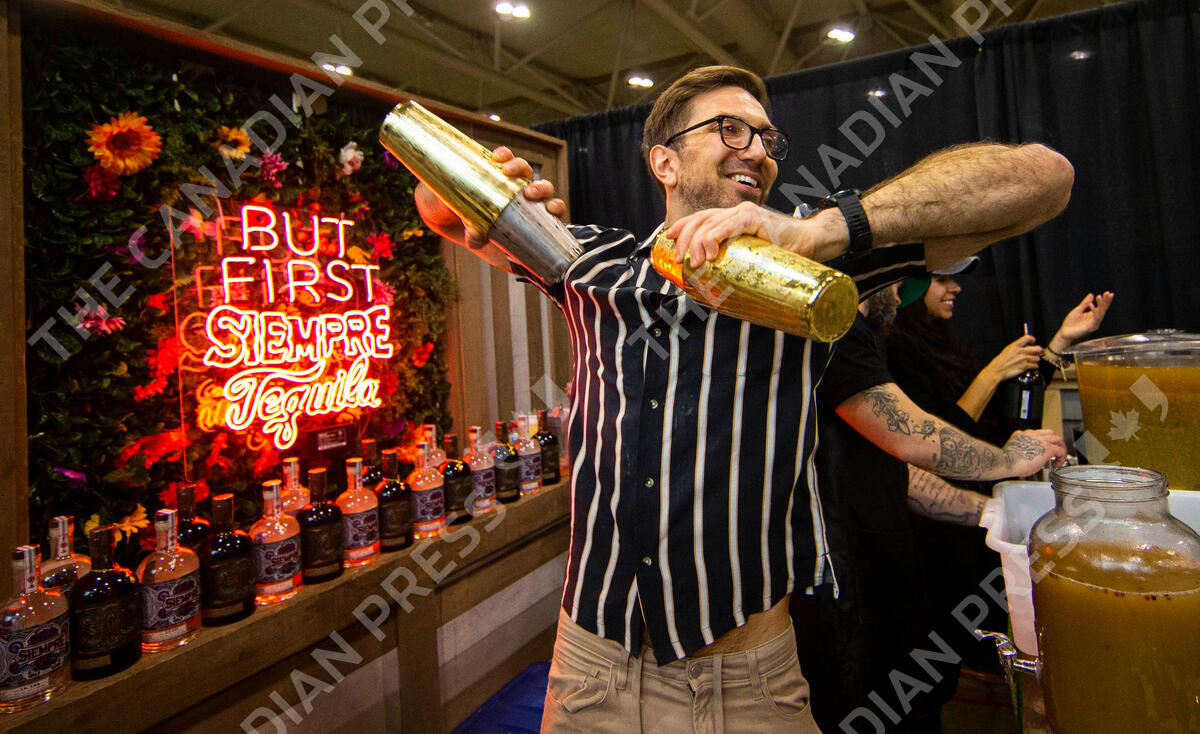 TORONTO, April 24, 2022 A bartender shakes cocktail shakers during the T.O. Food & Drink Fest in Toronto, Canada, on April 23, 2022. The T.O. Food & Drink Fest made its debut here from April 22 to 24 with over 150 exhibitors. (Credit Image: © Zou Zheng/Xinhua via ZUMA Press)
