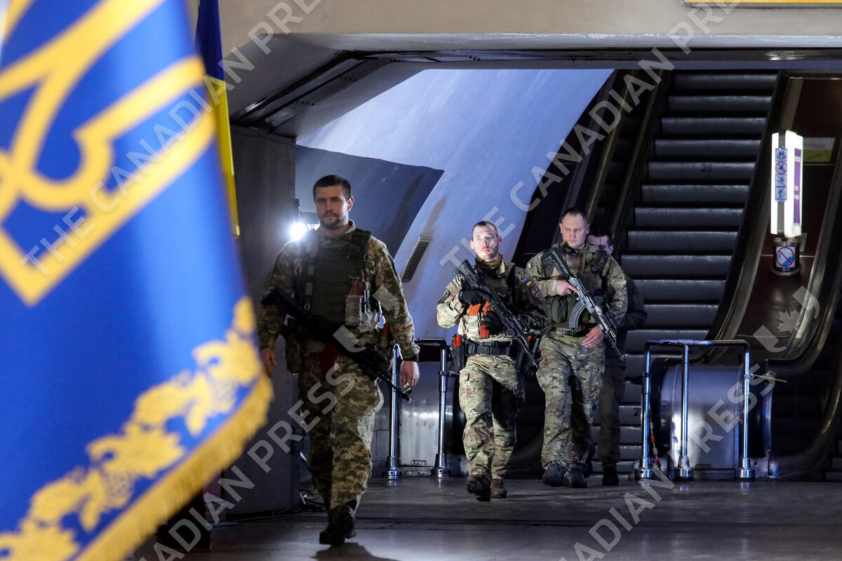 April 23, 2022, Kyiv, Ukraine: Servicemen are pictured during a press conference by President of Ukraine Volodymyr Zelenskyy given to International and Ukrainian reporters at a metro station in Kyiv, capital of Ukraine. (Credit Image: © Volodymyr Tarasov/Ukrinform via ZUMA Press Wire)