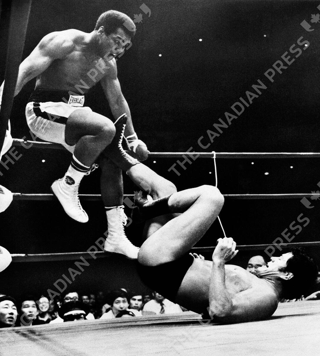FILE - This July 26, 1976 file photo shows Muhammad Ali trying to evade kicks by wrestler Antonio Inoki during their 15-round World Martial Arts match in Tokyo. Ali was the heavyweight champion again and in search of an easy payday when he went to Japan to meet professional wrestler Antonio Inoki in a 15-round match. (AP Photo/File)