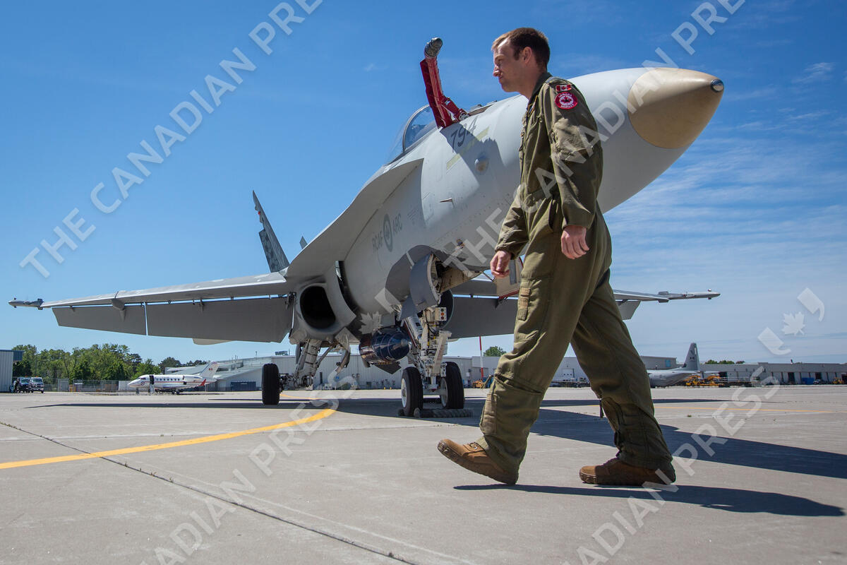 Captain Jesse Haggart-Smith from CFB Cold Lake walks past a CF-18 Horent at Canadian Forces Base Trenton in Trenton, Ontario, on Monday, June 20, 2022. THE CANADIAN PRESS IMAGES/Lars Hagberg