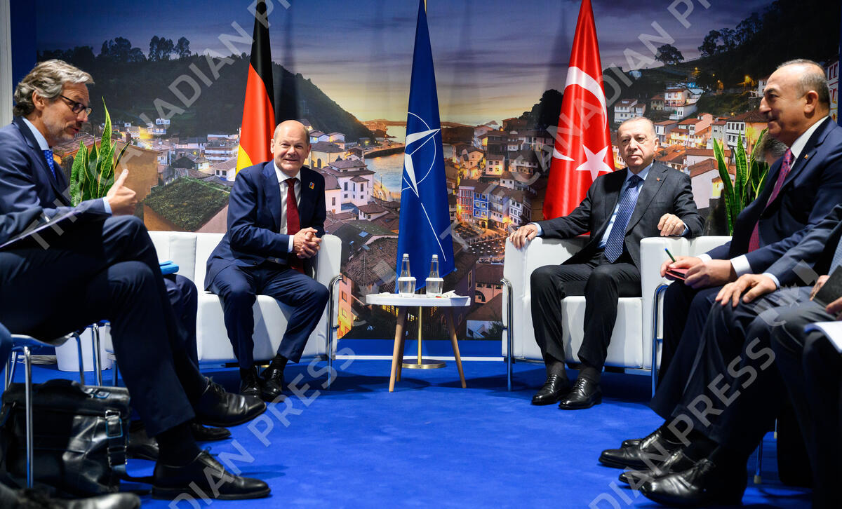 30 June 2022, Spain, Madrid: German Chancellor Olaf Scholz (2nd from left, SPD) and Recep Tayyip Erdogan, President of Turkey, meet for bilateral talks at the NATO summit in Madrid. Jens Pl̦tner (l), Foreign and Security Policy Advisor in the Federal Chancellery, and Mevlut Cavusoglu (r), Foreign Minister of Turkey, are present. At the two-day summit, the heads of state and government of the 30 alliance states are expected to take decisions on the implementation of the ''NATO 2030'' reform agenda. (Credit Image: © Bernd Von Jutrczenka/dpa via ZUMA Press)