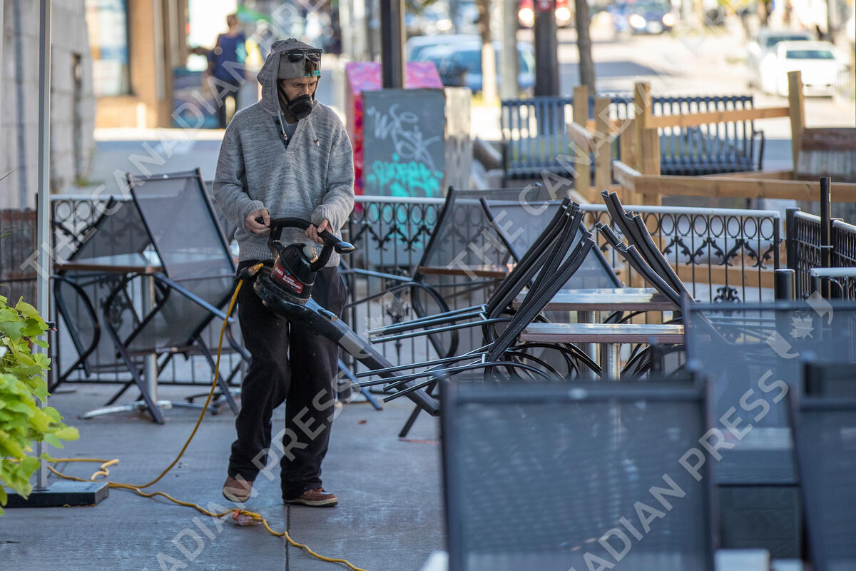 A person wears a mask as he cleans a patio in Kingston, Ontario on Wednesday, October 14, 2020, as the covid-19 pandemic continues in Canada. THE CANADIAN PRESS IMAGES/Lars Hagberg