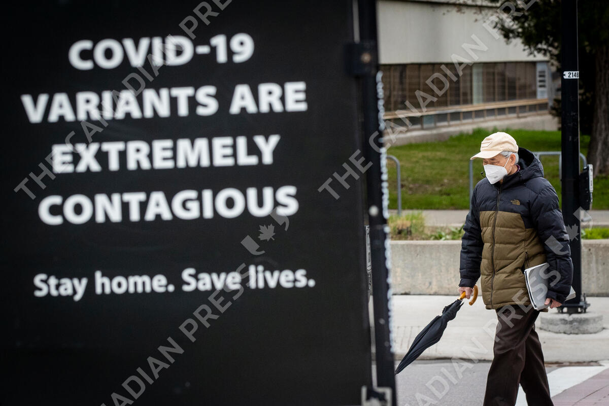 A person wears a N95 mask to protect them from the COVID-19 virus while walking by a sign about ongoing pandemic, ongoing pandemic in Kingston, Ontario on Friday, April 16, 2021. THE CANADIAN PRESS IMAGES/Lars Hagberg