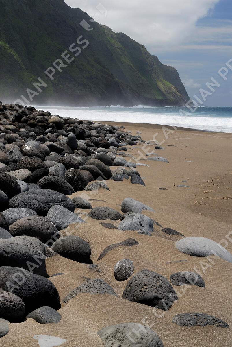 Black sand beach with lava boulders at Kalaupapa leper colony
