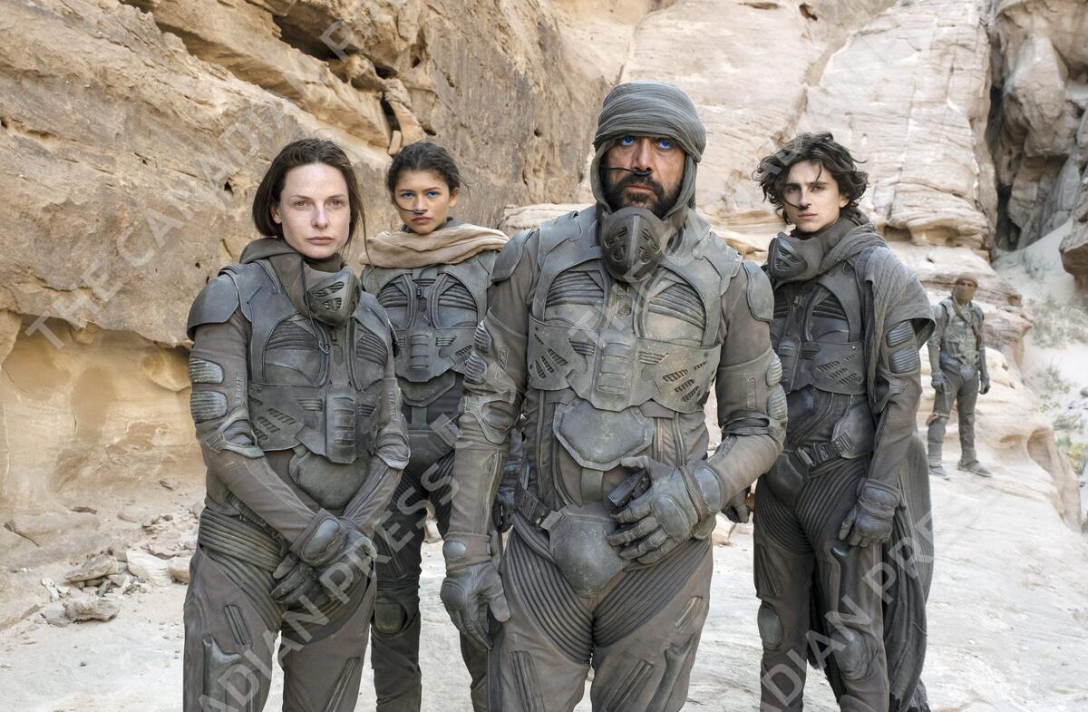 DUNE, from left: Rebecca Ferguson, Zendaya, Javier Bardem, Timothee Chalamet, 2021. ph: Chiabella James /© Warner Bros. /Courtesy Everett Collection