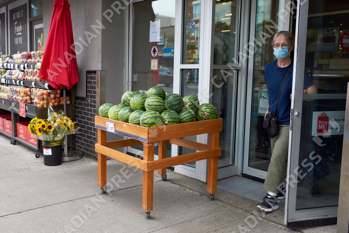 An older woman wearing a protective face mask pulls a wheeled cart as she exits a grocery store in Toronto, on Aug. 24, 2022. A sign to bring your own bag is seen on the door. THE CANADIAN PRESS IMAGES/Rachel Verbin