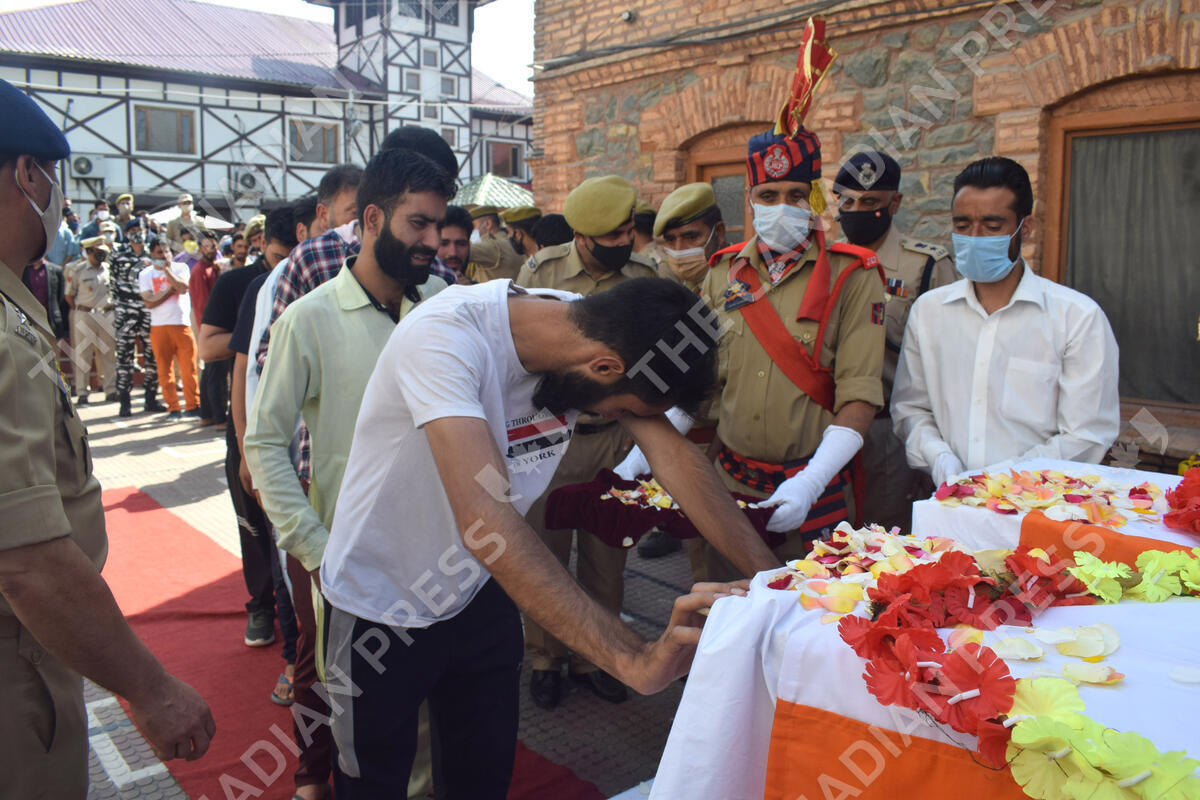 Sopore, Kashmir. June 12th 2021. Family members crying during wreath laying ceremony of two policemen who were killed. At least two security personnel and two civilians were killed in a militant attack in north Kashmir's Sopore. At least three others, including a policeman were injured in the attack. They fired at a joint party of the Central Reserve Police Force (CRPF) and police near Main Chowk Sopore in Baramulla district of Jammu and Kashmir.