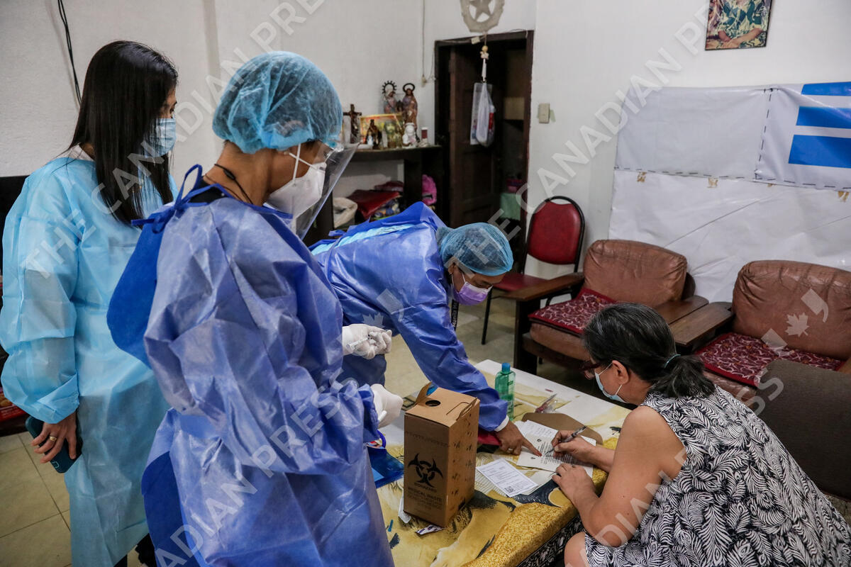 Medical workers prepare to inoculate a bedridden patient during a house vaccination in Manila, Philippines.