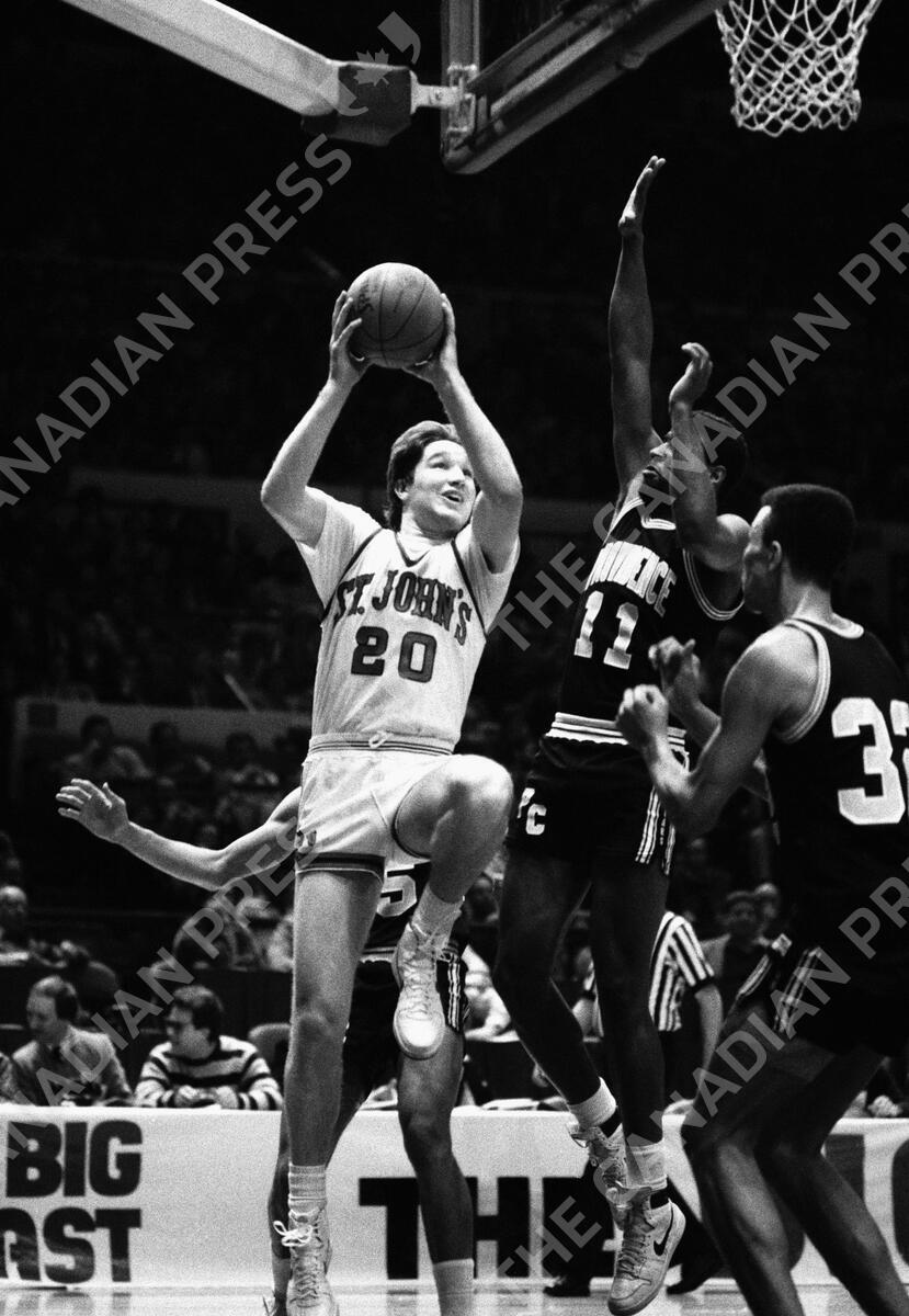 FILE - In this March 7, 1985, file photo, St. John's University's Chris Mullin,left, goes up for a basket as Providence's Keith Lomax, center and Ray Knight defend, during their Big East tournament game at New York's Madison Square Garden. Mullin, St. John's all-time leading scorer and still the face of its basketball program three decades after his career ended, has agreed to coach the Red Storm, a person with knowledge of the discussions told The Associated Press on Monday, March 30, 2015. The person spoke on condition of anonymity because there was no formal announcement.(AP Photo/Ray Stubblebine, File)