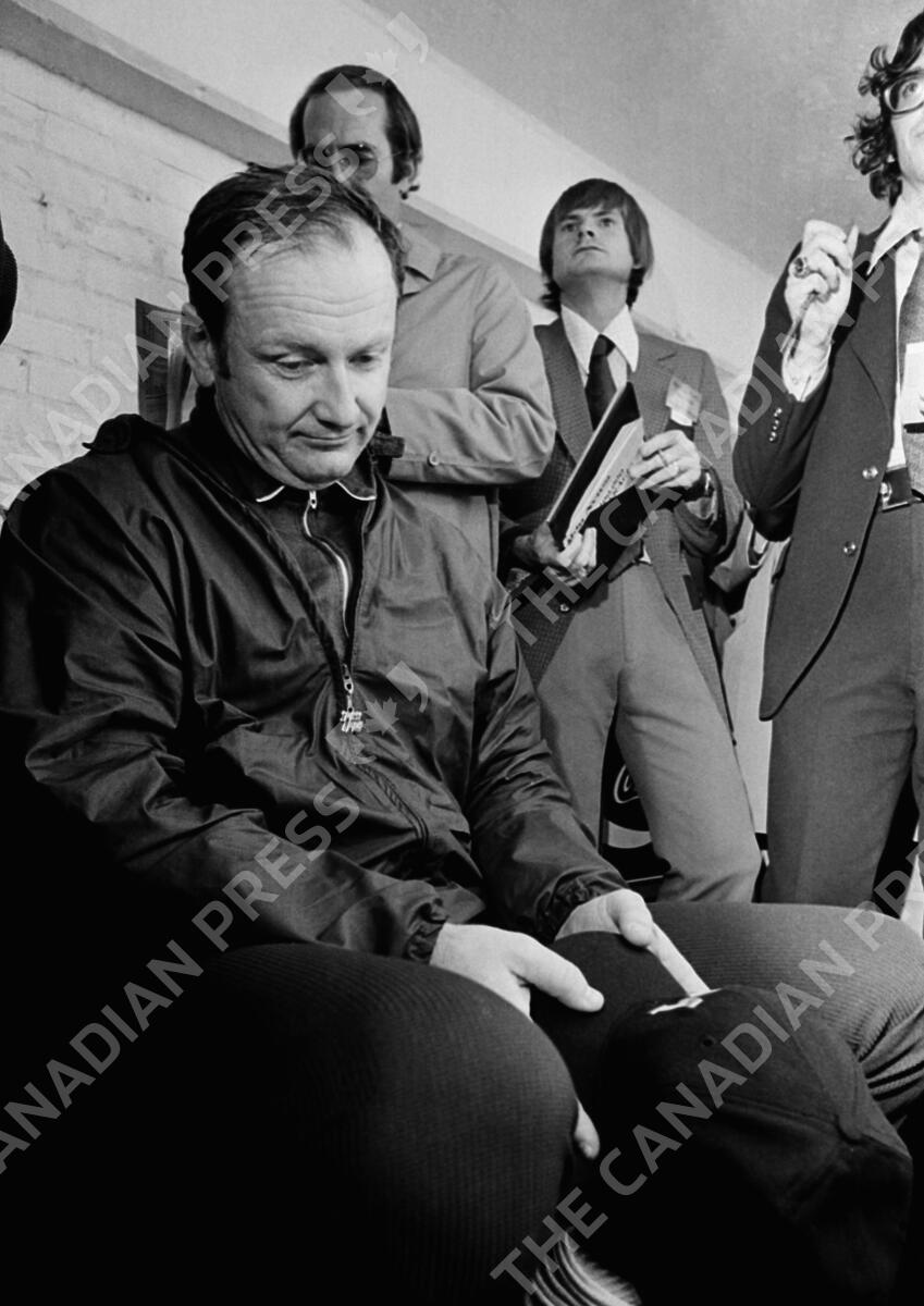 FILE - In this Nov. 24, 1973, file photo, Michigan football coach Bo Schembechler bows his head as he is interviewed after a 10-10 tie against Ohio State in Ann Arbor, Mich. No. 2 Ohio State and No. 3 Michigan have a chance to add to the lore of The Game, a football rivalry that is widely regarded as one of the best in sports, when they meet again, on Saturday, Nov. 26, 2016. (AP Photo/File)