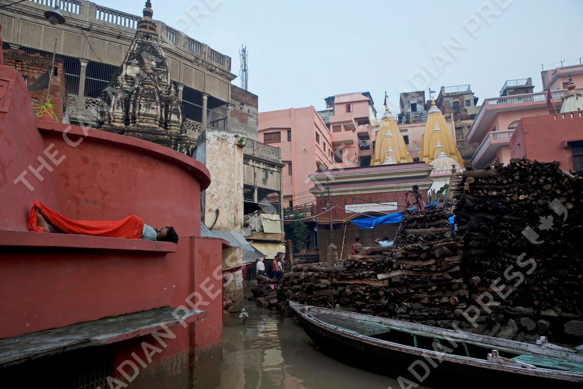 An Indian man sleeps outside a temple as local workers stack woods to be used for funeral pyres at the flooded Manikarnika Ghat in Varanasi, India, Saturday, Aug. 27, 2016. As the mighty Ganges River overflowed its banks this past week following heavy monsoon rains, large parts of the Hindu holy town of Varanasi were submerged by floodwaters, keeping away thousands of Hindu devotees. Varanasi is a pilgrim town that Hindus visit to take a dip in the holy Ganges. (AP Photo/Tsering Topgyal)