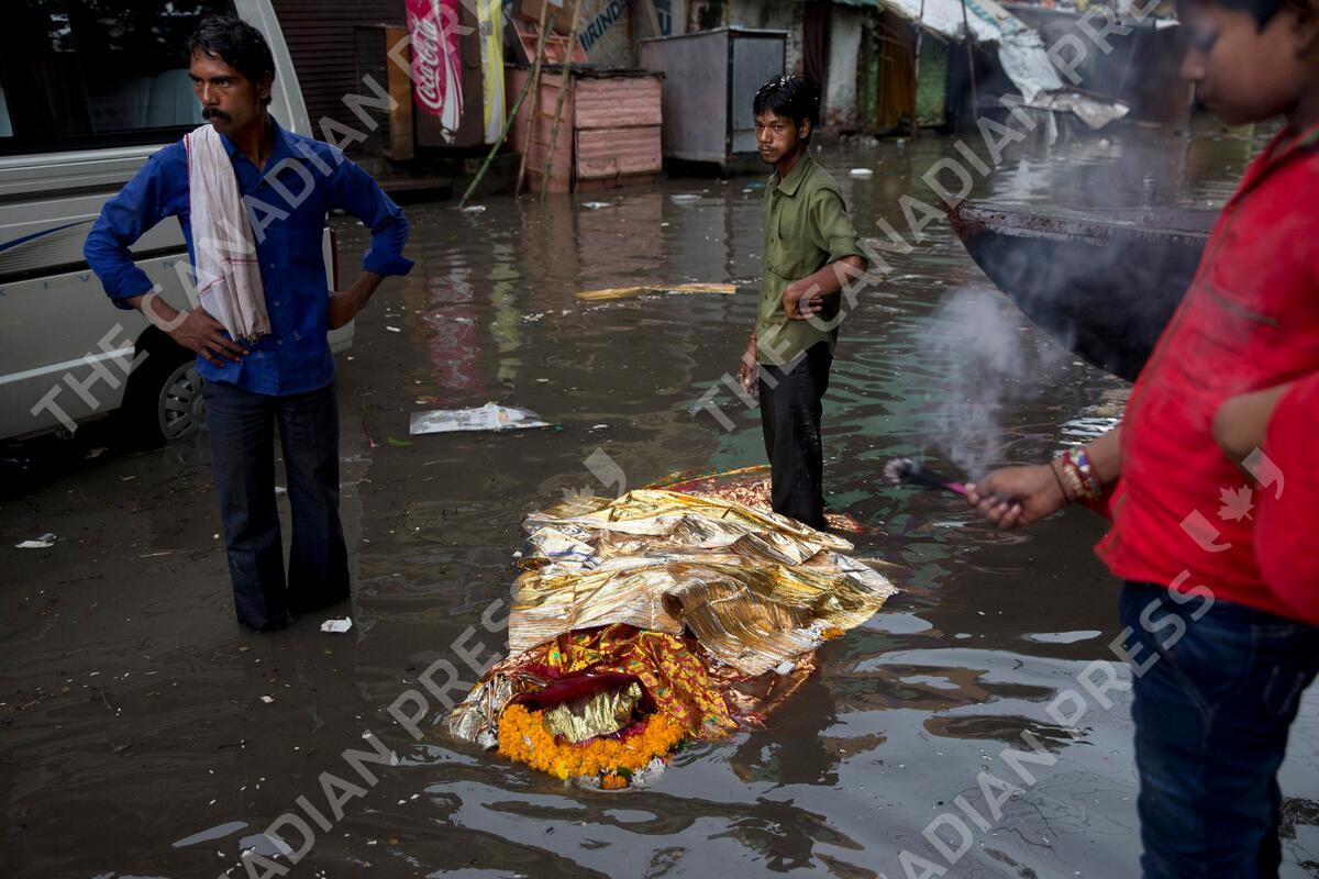 In this Friday, Aug. 26, 2016 photo, a dead body lies in a flooded street before performing a Hindu funeral at the Harishchandra Ghat in Varanasi, India. As the mighty Ganges River overflowed its banks this past week following heavy monsoon rains, large parts of the Hindu holy town of Varanasi were submerged by floodwaters, keeping away thousands of Hindu devotees. Varanasi is a pilgrim town that Hindus visit to take a dip in the holy Ganges. (AP Photo/Tsering Topgyal)