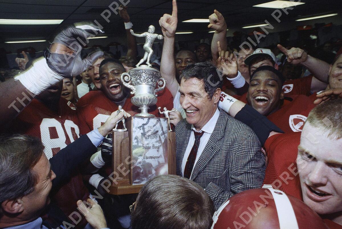 FILE - In this Jan. 1, 1993, file photo, Alabama coach Gene Stallings celebrates with his team after receiving the Sugar Bowl trophy following the Tide's 34-13 win over top-ranked Miami, in New Orleans. In 1992, the Bowl Coalition was formed and arranged a Sugar Bowl with No. 1 Miami and No. 2 Alabama that made for a nice tidy championship. (AP Photo/Dave Martin, FIle)