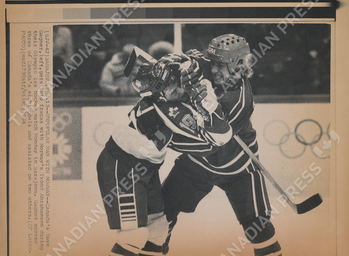 Canada’s Dave Gagner (left) gets into a fracas with Norway’s Trond Abrahamsen during their Olympic ice hockey match in Sarajevo, Monday, February 13, 1984. Gagner scored during three of Canada’s eight goals and assisted on two others. THE CANADIAN PRESS/Jim Wiley