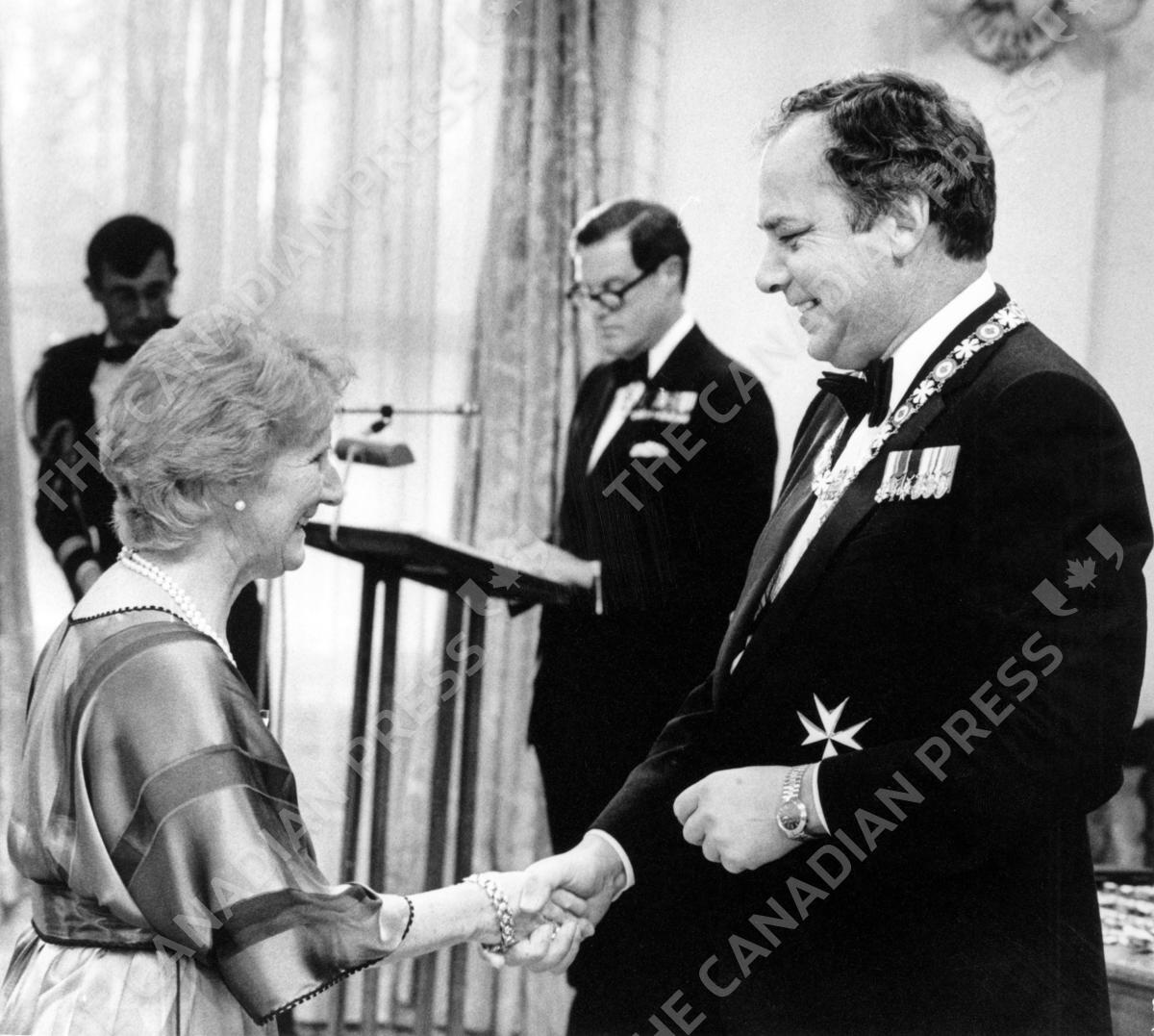 Dr. Antonine Maillet receives the Honor of Campanion of the Order of Canada from Governor General Ed Schreyer in Ottawa on April 21, 1982. The Canadian Press/Peter Bregg